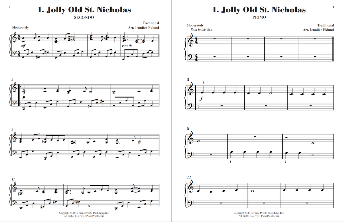 You can see samples of the entire book on the Piano Pronto website. Here’s a quick look at a couple of my favorites from “Christmas for Two” to give you an idea of the level:
