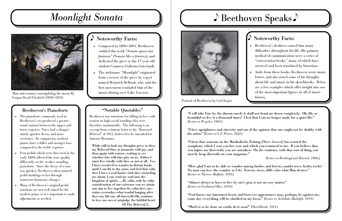If you’ve got decision fatigue, this multi-pack will help you with that! It includes the easy piano and two intermediate arrangements, plus the music history pages. The only thing it doesn’t include is “A Touch of Moonlight.”