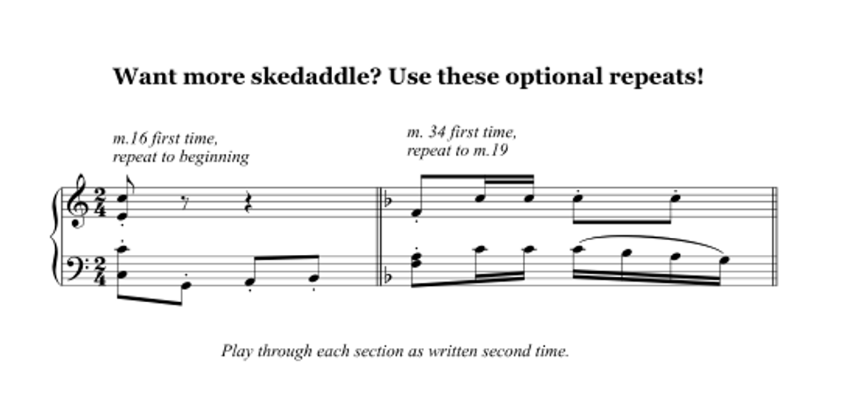 If the performer wishes to make the piece a bit longer, here is a suggestion for repeats. It may make the piece more repetitious, but ragtime music often IS repetitious. Personally, I play it as written, and the 1:30 timing puts it in line with pageant and talent show guidelines.
