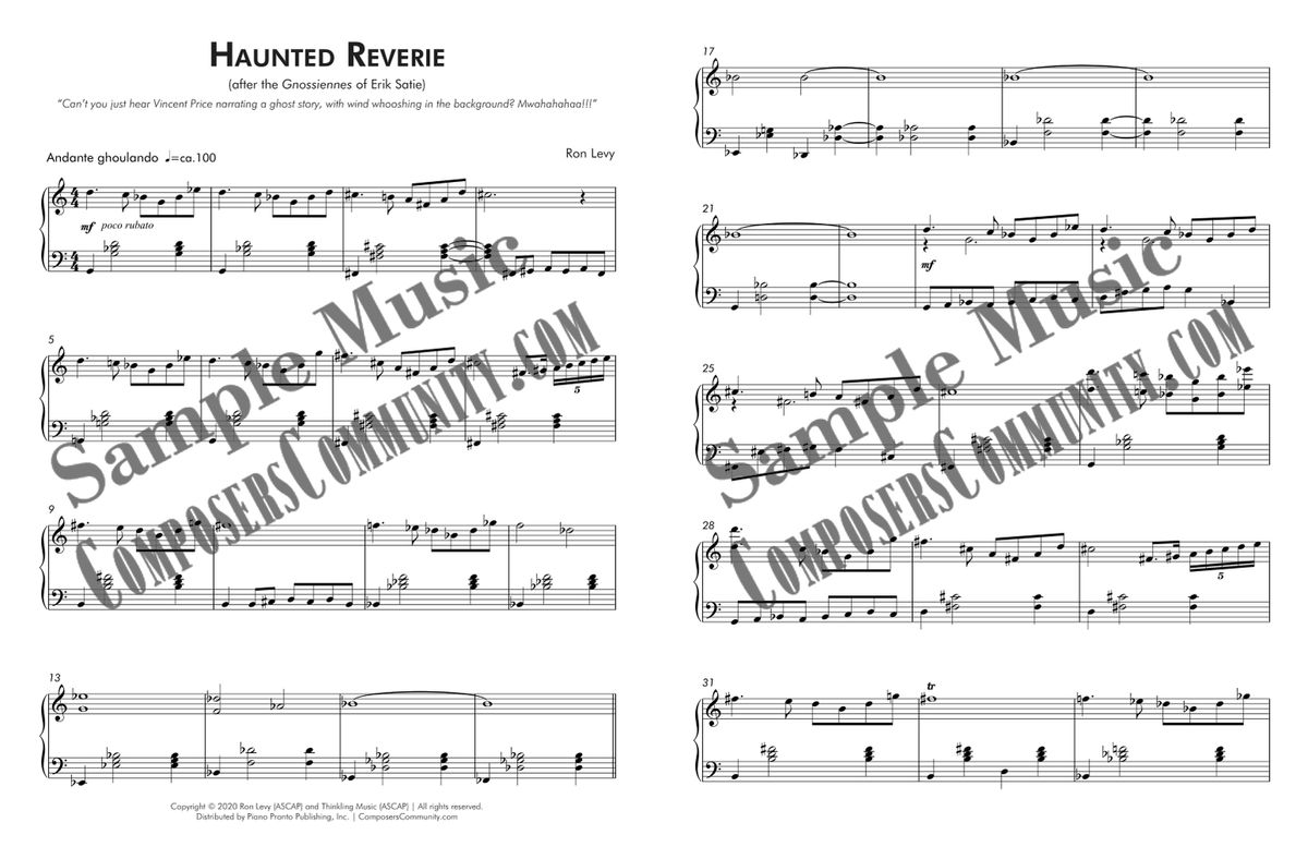 Influenced by Eric Satie’s Gnossiennes, the spooky quality of the piece is due in large part to the preponderance of minor triads moving to unrelated keys. For example, the opening G minor harmony moves down by a half-step to F-sharp minor in measures 3-4. And so it goes for the remainder of the piece, with some forays into major, but not enough to dispel the overarching haunted quality.