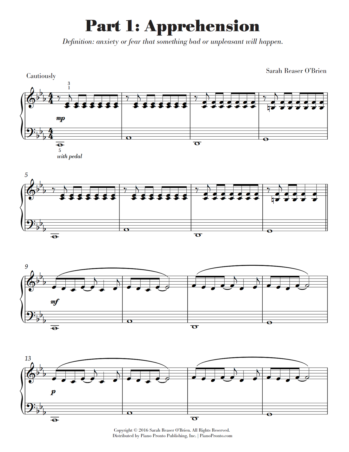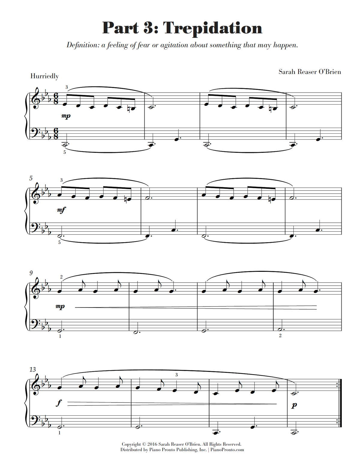 “Apprehension” features a foreboding left-hand melody consisting of whole notes and half notes, while the right hand gives nervous and trembling support with an accompaniment of repeated eighth note thirds. There’s a tiny bit of syncopation in the middle section when the right hand takes the melody, but nothing too daunting for late elementary or early intermediate students.