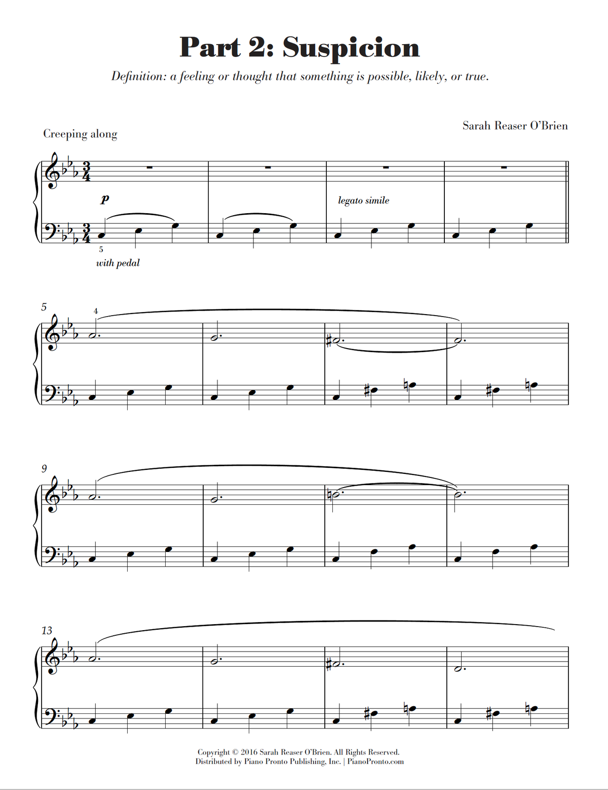 My experience has been that students naturally love the first and third pieces. Those are the flashy and fun ones that make it easy to impress their audiences. It is a mature student who can appreciate the slower-paced second piece in the set and not rush through it. I always point that out to my students to spark some interest! One student of mine who learned the entire set told me that “Suspicion” was her favorite. When I looked surprised, she said, “It’s because it’s the most mysterious.”