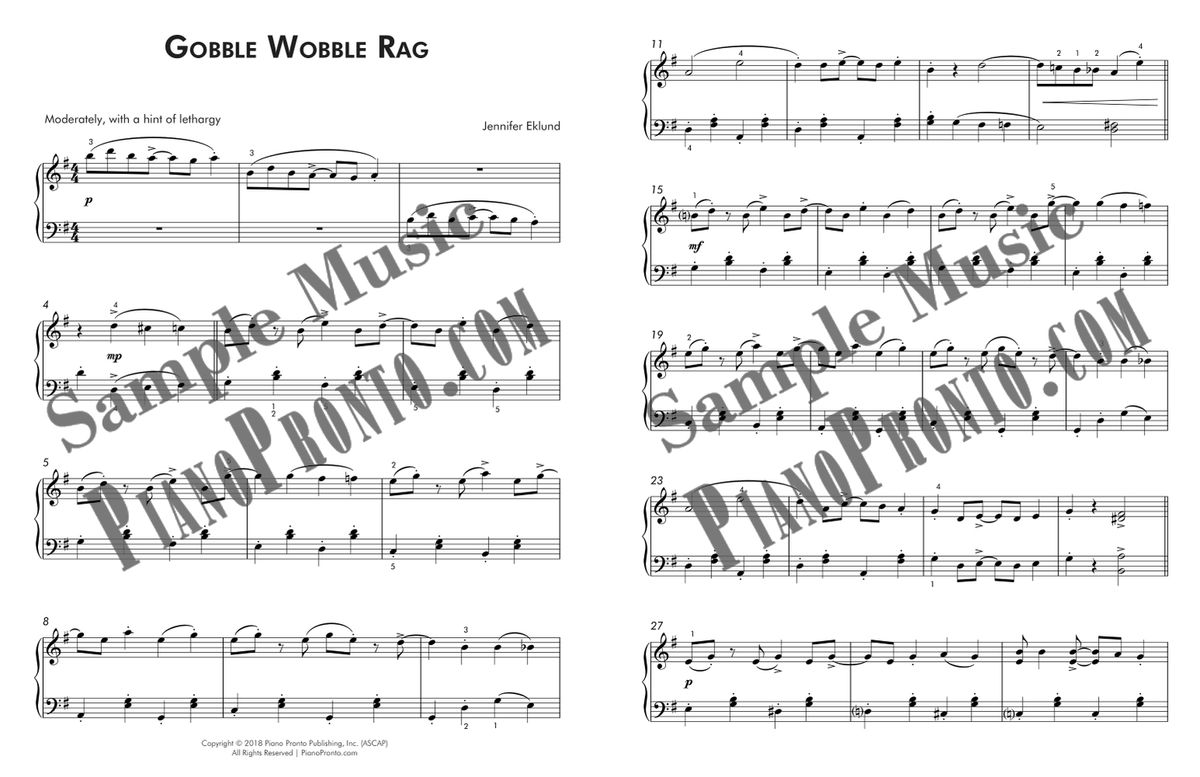Gobble Wobble Rag is an upbeat pattern-based ragtime solo composed by Jennifer Eklund. This is a great exercise for early intermediates with a focus on split articulations between the hands. Gobble, gobble!
