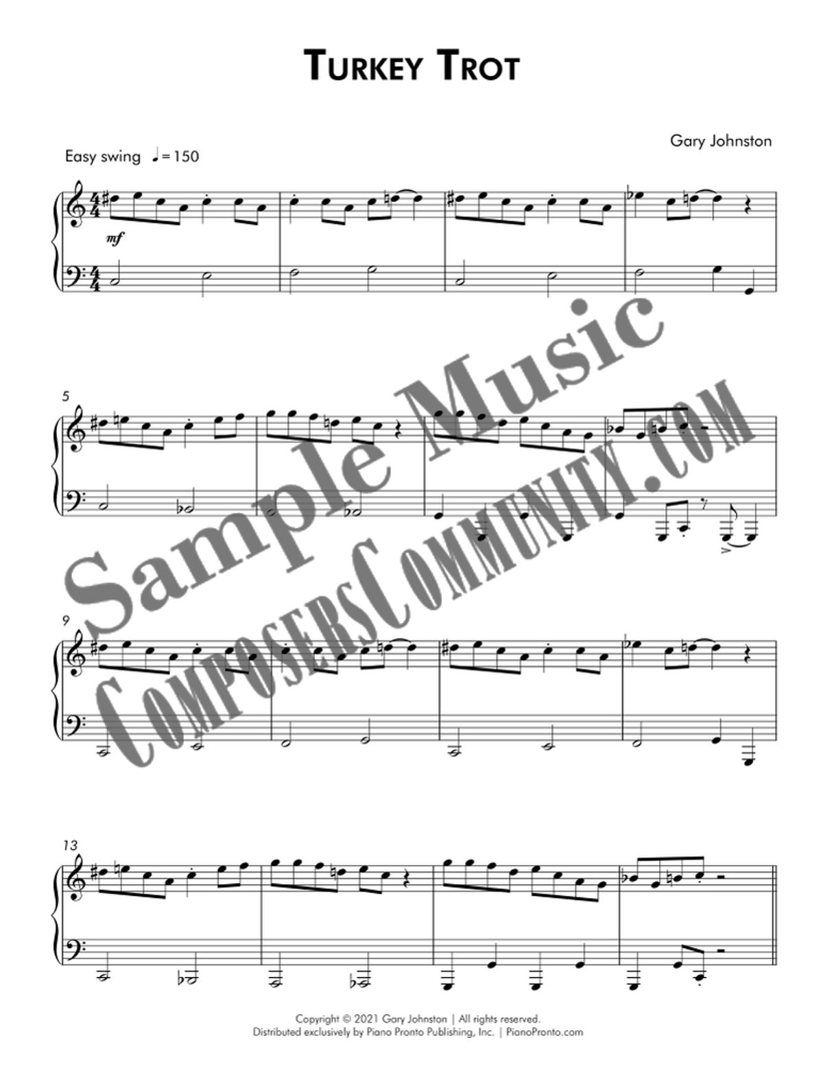 Turkey Trot, composed by Gary Johnston, is a bright, jazzy little piece for early intermediates with lots of syncopation and a half-time walking bass line.
